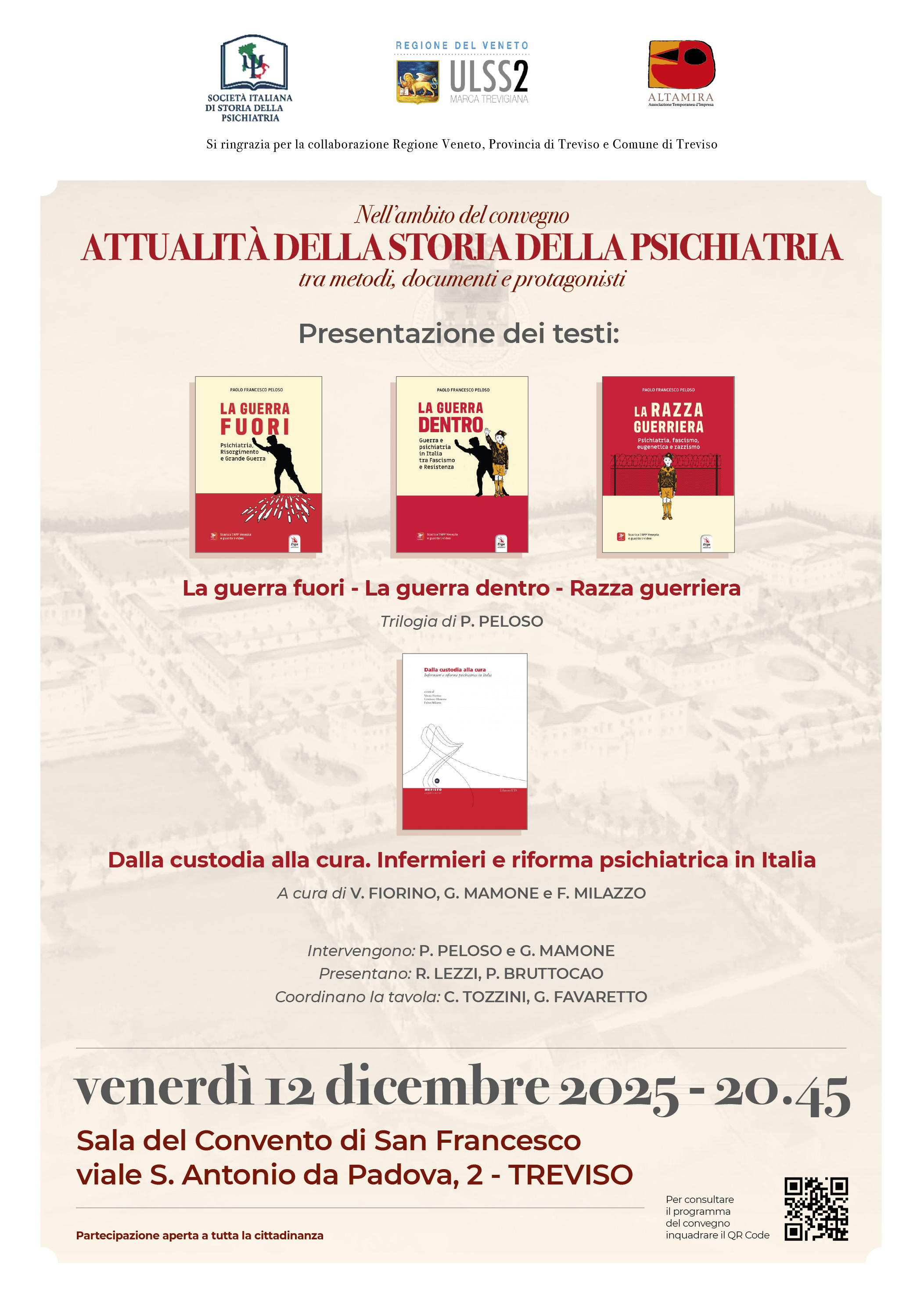 Si pubblicano di seguito la locandina e il pieghevole del Convegno di "Attualità della storia della psichiatria tra metodi, documenti e protagonisti" che si terrà a Treviso, presso l'Auditorium della Provincia (ex ospedale psichiatrico Sant'Artemio) il 12 e 13 dicembre 2025.